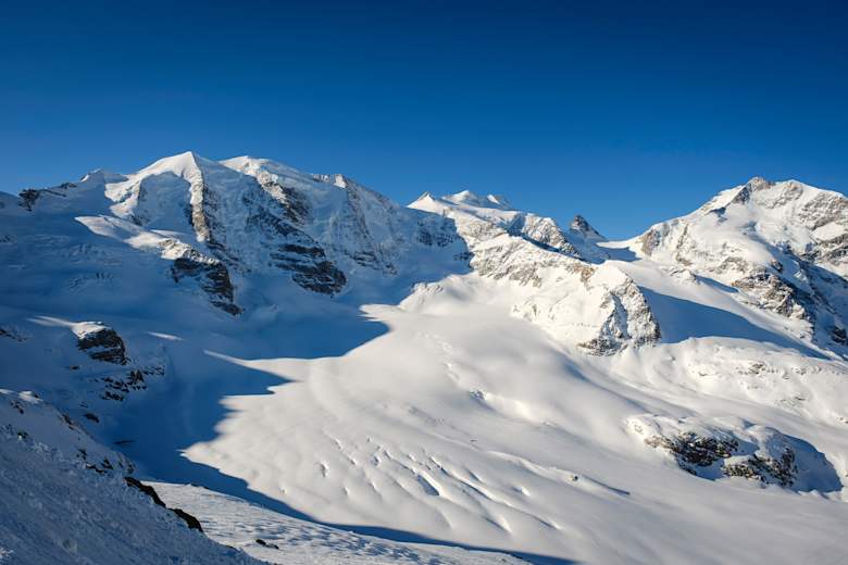 Am äußeren, nördlichen Rand des Valdret Pers zieht es einen recht flach in die Mitte dieser fantastischen Arena der Bernina Alpen. Vor einem der mächtige dreigliedrige Stock des Piz Palü, biegt man zentral gegen Westen ab.
