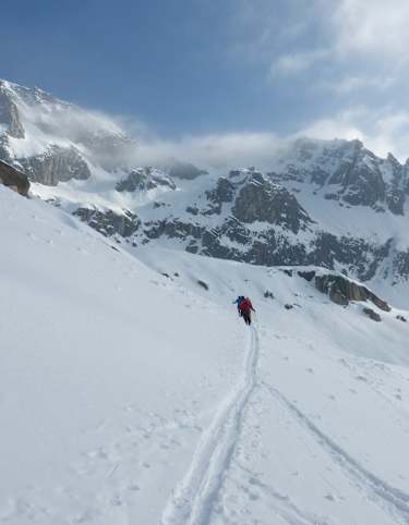 Von der Moräne spurt man Richtung Süden mit möglichst wenig Höhenverlust in Richtung Blümlisalpfirn. Die Spaltenzonen auf ca. 2.500 m umgeht man westlich, dann hält man auf den Sattel westlich des Brunnistocks zu.