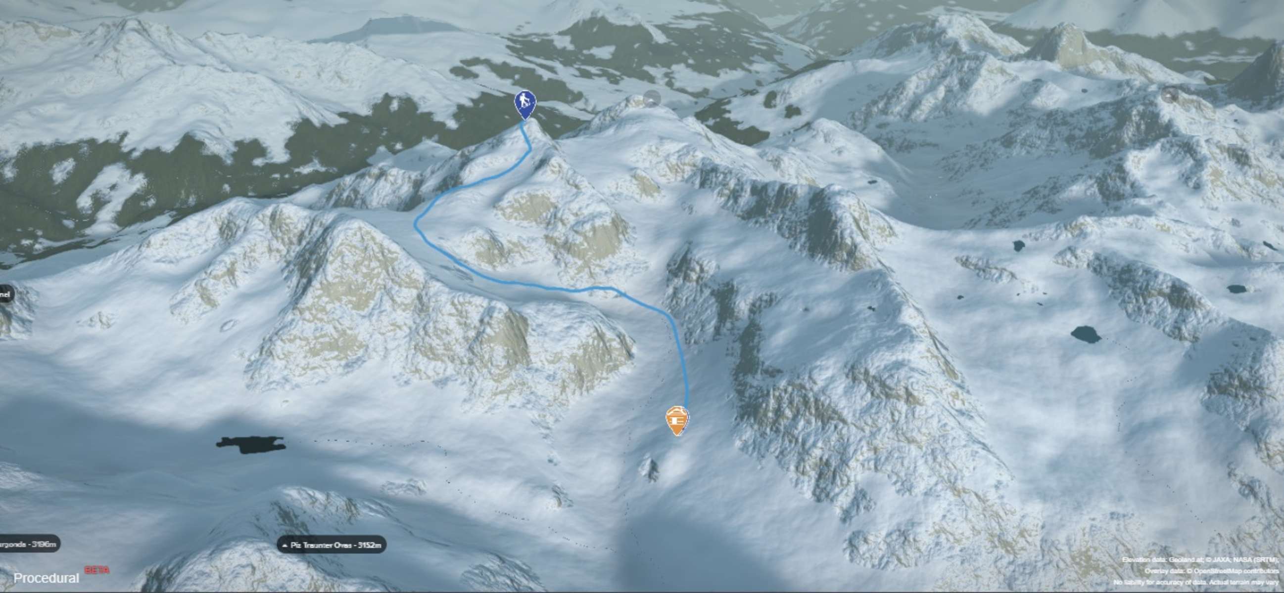 Auf ca. 3.100 m erreicht man einen flachen Gletschersattel. Dort wendet sich die Spur nach Norden über einen häufig etwas abgeblasenen Hügel (P. 3.166) und bald über den steiler werdenden Hang zum Gipfel. Bei guten Verhältnissen erreicht man diesen mit Ski, sonst lässt man die letzten, sehr steilen Meter aus und genießt gleich die Abfahrt über die wunderbaren Gletscherflächen.