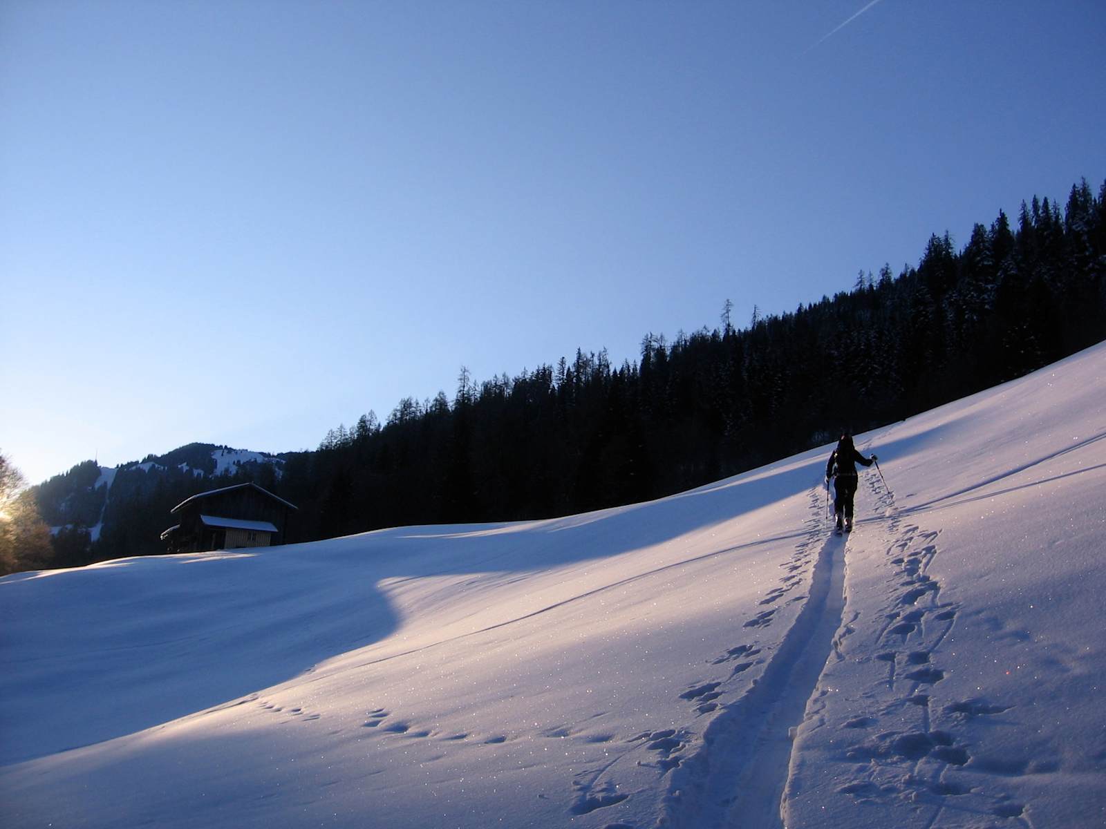 Der Schnee ist auf der gesamten Tour wegen der Nordausrichtung des Hanges meist auch einige Tage nach Neuschnee mit wunderbaren Pulver gefüllt. Sobald die Lichtung ein wenig an Steilheit verliert, erreicht man Untersäss (1.740 m) und etwas später Obersäss (1.947 m). Hier ist der Wald gänzlich gewichen und man hat offene Hänge vor sich.