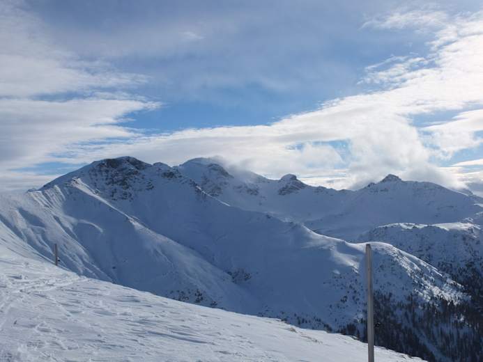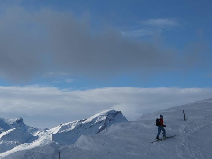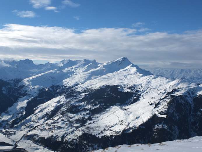 Das Muttner Horn (2.401 m) bietet eine gute Einführung in die Berge der Platta-Gruppe und ist eine gute Wahl, wenn die Zeit knapp ist und die Lawinensituation etwas Zurückhaltung verlangt. Der Aufstieg kann in zwei Abschnitte eingeteilt werden - die Hänge oberhalb von Mutten und der lange Quergang auf der Muttner Alp. - Angenehme und recht einfache Skitour in Graubünden.
