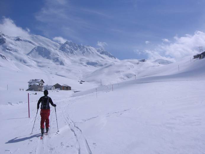 Der wunderschöne Skitourentag beginnt kurz oberhalb von Bivio an der Talstation des Skilifts an der Julierpassstraße.