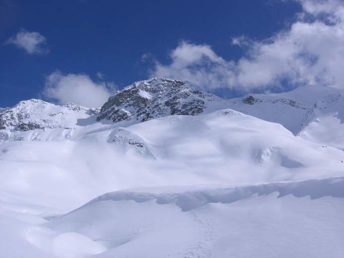 Interessant ist jetzt aber vielmehr der Südhang, der zum Roccabella führt: und dieser ist schon etwas steiler und kann bei Hartschnee Harscheisen erfordern.