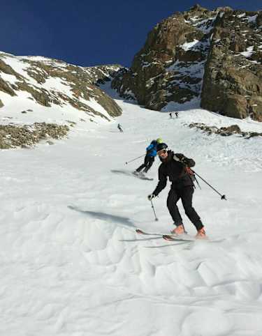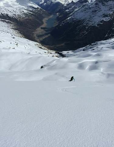 Vom Skidepot zum Pass entlang der Aufstiegsspur. Es folgt ein schöner Abfahrtshang durch einen breiten Kessel, nördlich am Bletschaturra vorbei. Immer weiter werden die Hänge und Richtung Südost geht es weiter bis die Gondelbahn ins Sichtfeld rückt und man die letzten Meter ins Tal auf der Piste zurücklegt.