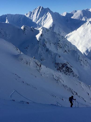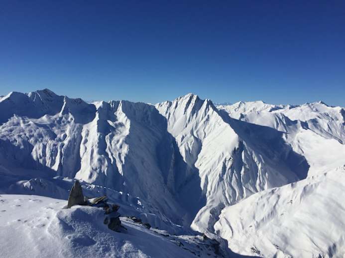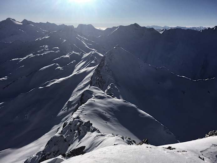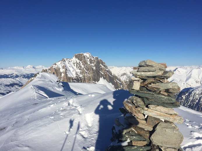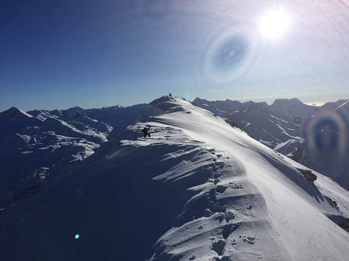 An der kleinen Stufe richtet man ein Skidepot ein und geht die letzten 200 m zu Fuss zum Gipfel auf 3.022 m, von wo man ausgiebig seine Abfahrtsspuren vom Schwarzhorn bewundern kann.