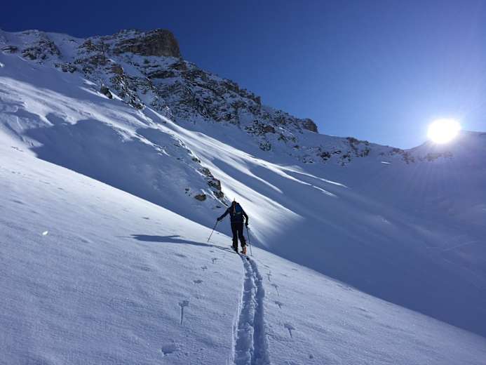 Der Aufstieg zum Schwarzhorn verläuft zunächst noch flach, steilt dann jedoch immer weiter auf. Je nach Verhältnissen kann es ratsam sein, ein paar Meter zu Fuss zurückzulegen.