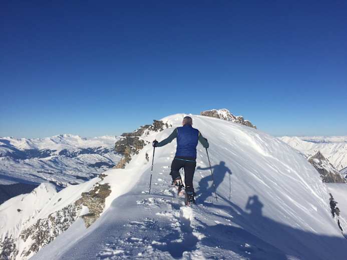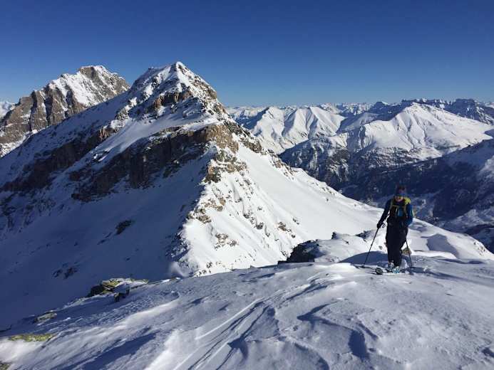 Am Grat angekommen hält man sich westwärts und setzt den Anstieg mit Skiern bis zum Gipfel des Schwarzhorns auf (2.944 m) fort. Von hier hat man einen tollen Ausblick auf die imposante Steilflanke des Piz Terri und die Greina.