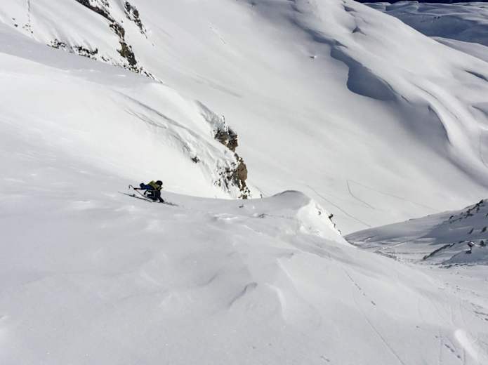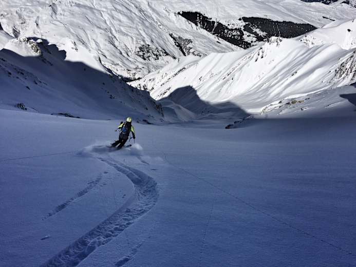 Vom Gipfel tolle Steilabfahrt Richtung Nordwest, dann etwas flacher auf breitem Hang mit viel Platz für große Schwüng, stets in Falllinie bis kurz oberhalb der Alp Patnaul.