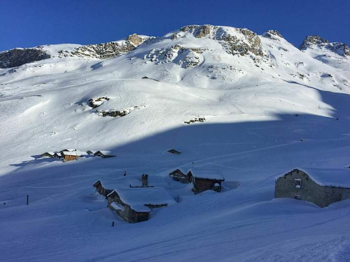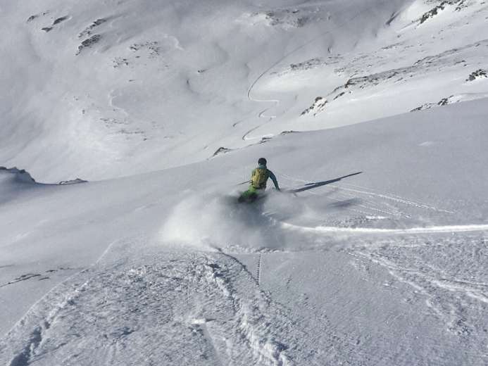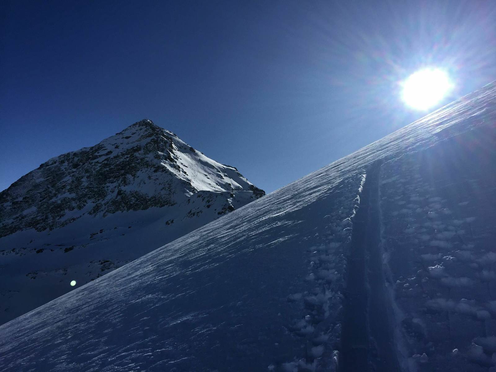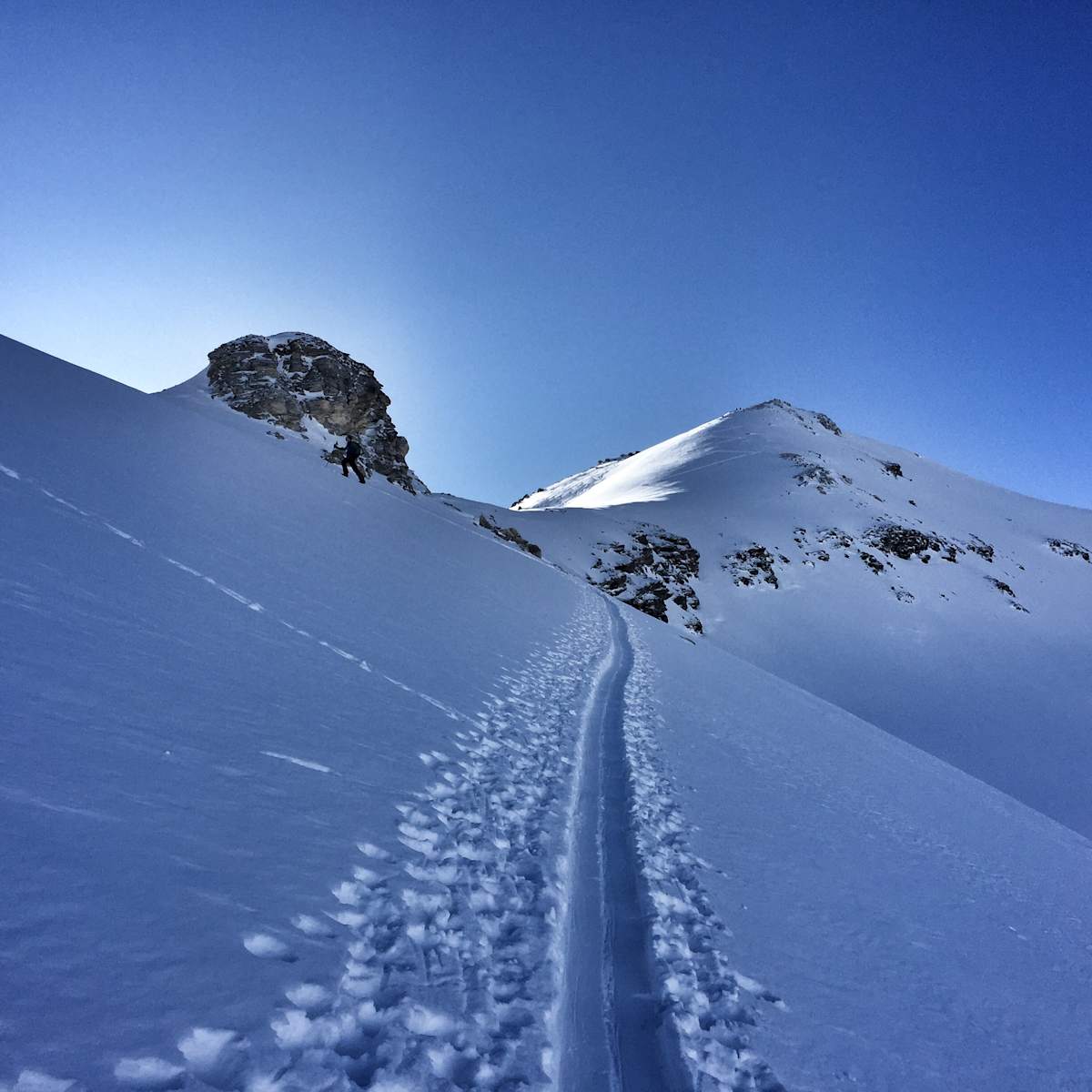 Die Abfahrt vom Fanellhorn auf dem schönen Südhang verspricht viel Abfahrtsspass. Wenn die Schneebedingungen den Aufwand lohnen direkt in der Fallinie zwischen den Felskorridoren abfahren und die paar Meter zum Rücken etwas anschieben. Ansonsten auch entlang der Aufstiegsspur den Hang etwas querend.