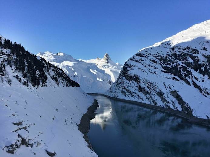 Kamera nicht vergessen und unbedingt einen Fotostopp auf der Staumauer einlegen: der Ausblick von hier auf den Stausee und das Zervreilahorn ist einfach magisch!