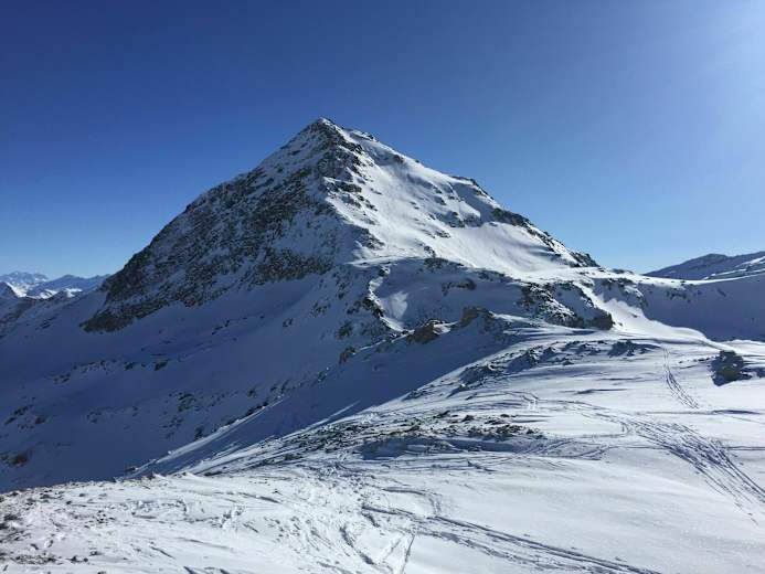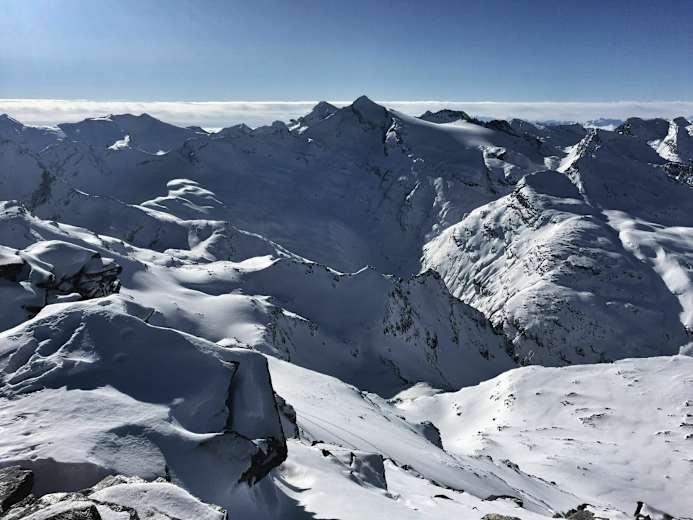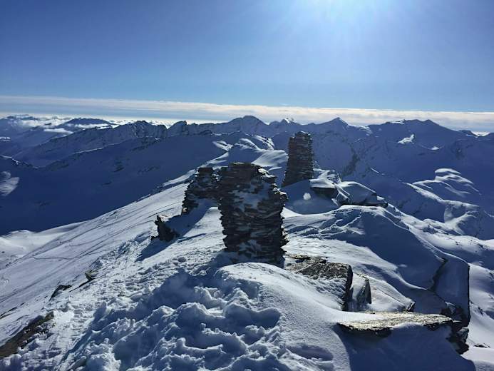 Stets dem breiten Rücken Richtung Südwest folgend erreicht man nach kurzer Zeit den Gipfel auf 2.866 m. Wer Zeit und Energie sparen möchte fährt direkt nach Süden ab in eine kleine Mulde, um von hier den Weiteranstieg zum Fanellhorn in Angriff zu nehmen.