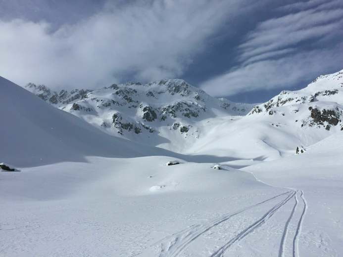 Kurz vor dem Anstieg zur Gfallenlücke beginnt der eigentliche Abfahrtsspass. In einem großen Linksbogen dreht man gegen Westen in Richtung Gafallensaum. Die breiten Abfahrtshänge bieten jede Menge Platz für eigene Spuren.