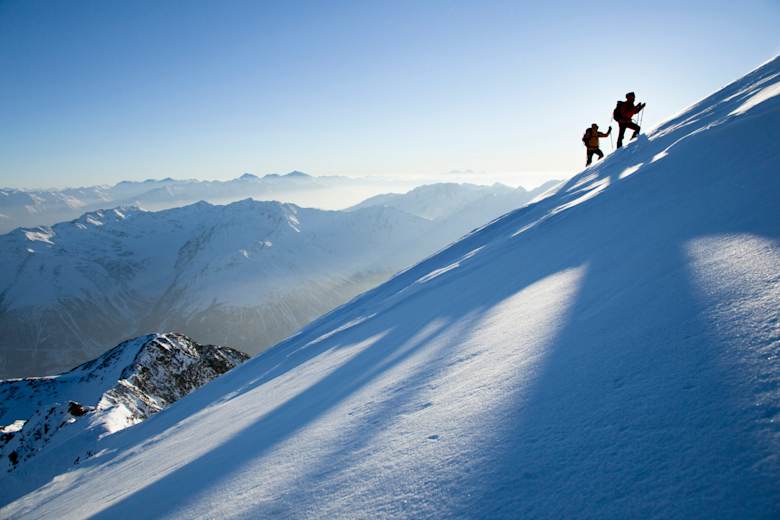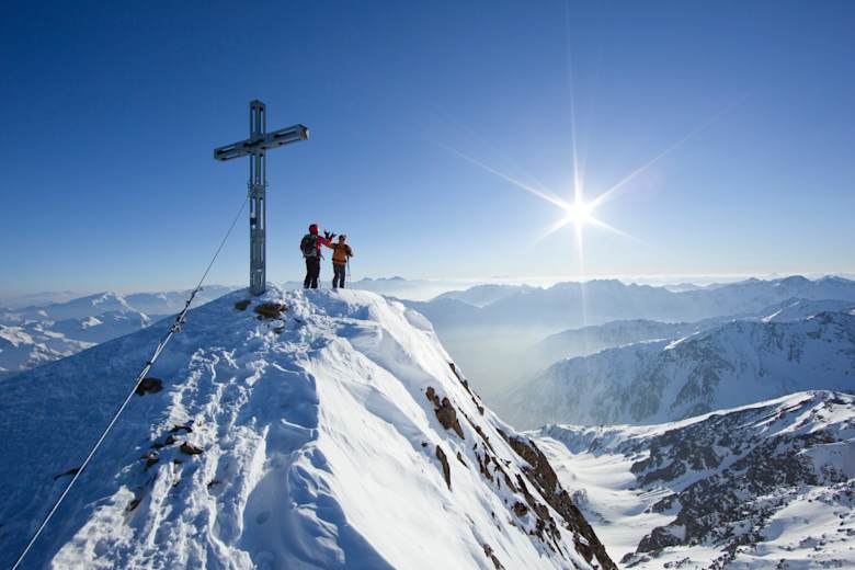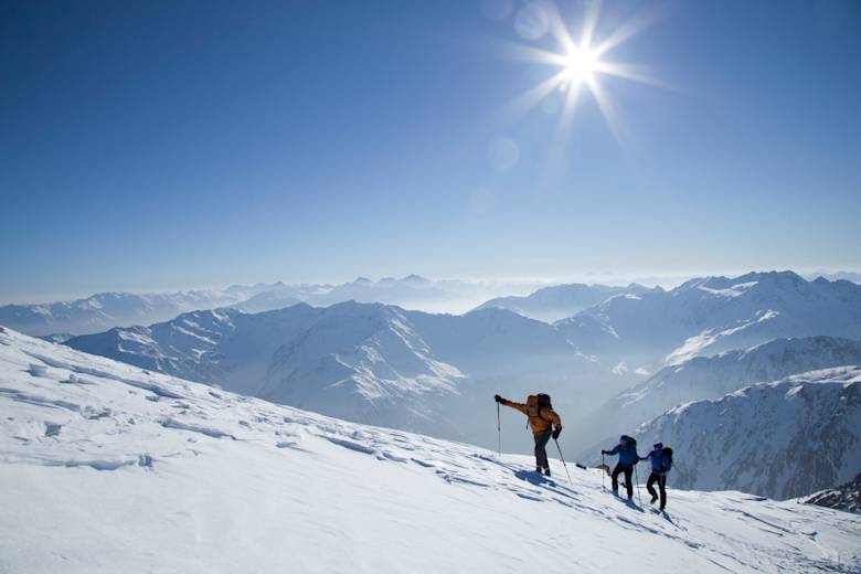 Am zweiten Tag der Venter Skihochtour im Herzen der Ötztaler Alpen geht es gleich ganz schön zur Sache: gleich zwei fantastische Gipfel werden erklommen. Zuerst geht es auf den Similaun mit 3.606 m und danach auf die Fineilspitze mit 3.514 m, bevor man das Tagesziel, die Schutzhütte „Schöne Aussicht“ erreicht.