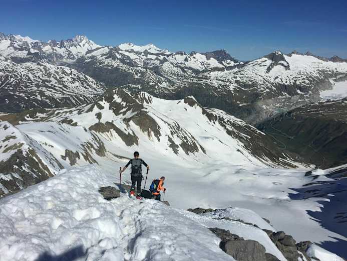 Gross Muttenhorn (3.099 m): hochalpines Flair, perfekte Bedingungen bis in den Frühsommer und eine unterhaltsame Gipfelkraxelei zeichnen diese beliebte Frühjahrsskihochtour am Furkapass aus. Lohnender Gipfel in der Zentralschweiz, an der Grenze der Kantone Uri und Wallis, dessen grosse Stunde nach Öffnung der Furkapassstrasse im Juni schlägt, wenn der Dreitausender mit moderater Höhendifferenz erreicht werden kann. Ideal für einen gemütlichen Saisonabschluss.