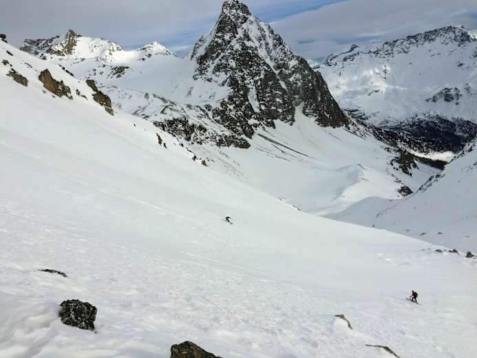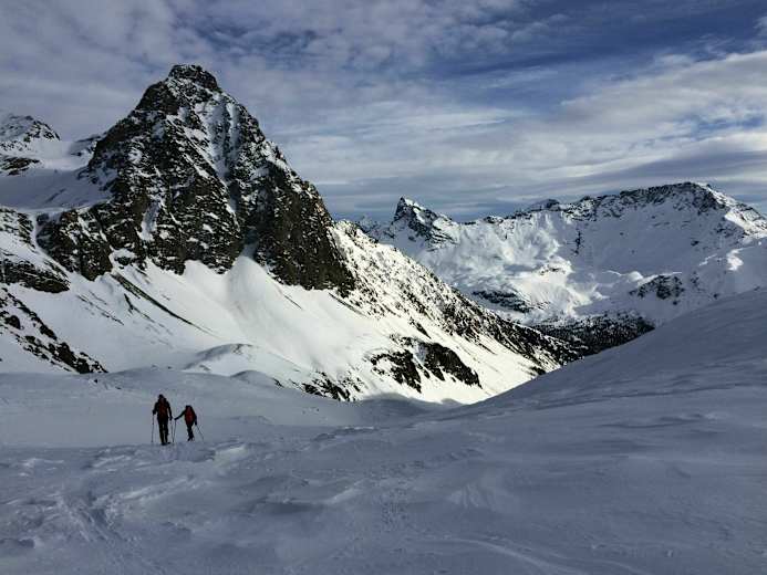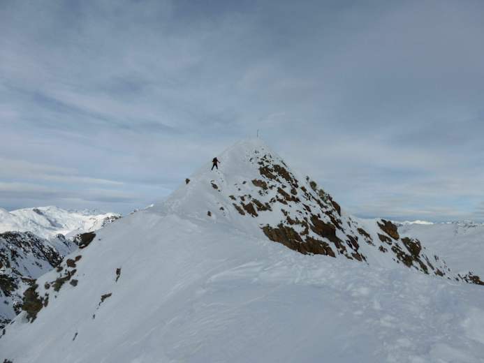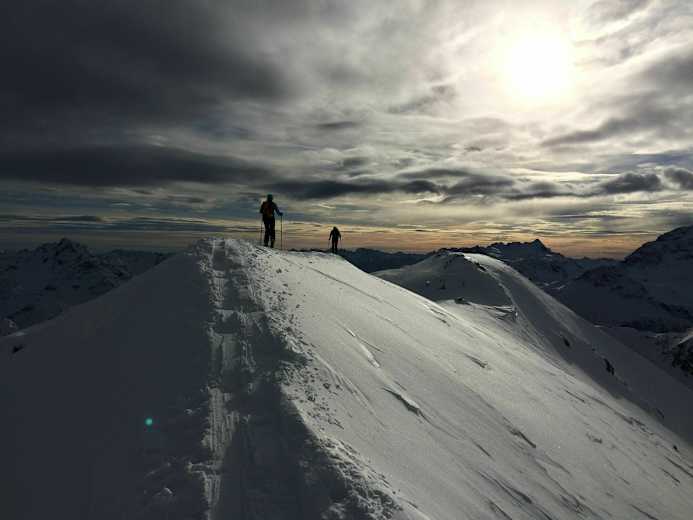 Nun weiter westwärts zur Scharte auf 2.904 m. Von dort folgt man dem Gratverlauf zum Piz Ursera, zunächst noch Skiern und schliesslich die letzten Meter zu Fuss bis man den Gipfel auf 3.031 m erreicht.