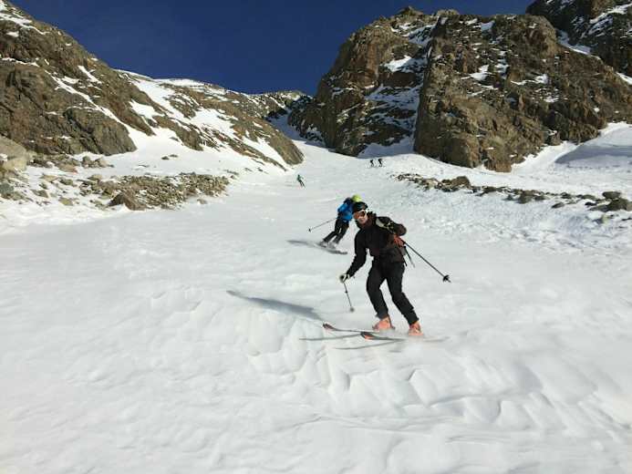 Zunächst Abstieg bis zum Skidepot. Dann heißt es nochmal volle Konzentration auf die anspruchsvolle Abfahrt durch das Steilkar Scispadus, welches gleich zu Beginn ein Gefälle von 40° aufweist.