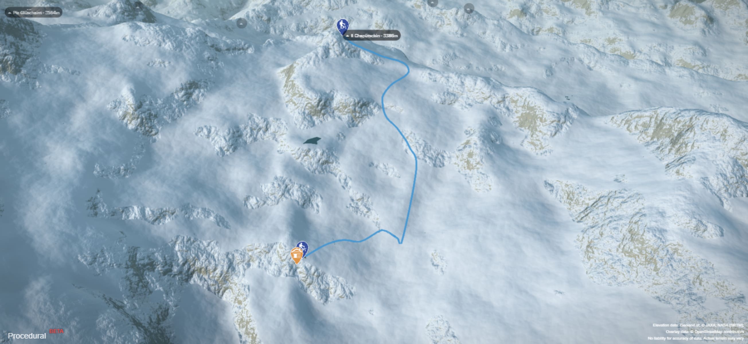 Von der Chamanna Coaz (2.610 m) leicht ansteigend in nordwestlicher Richtung. Nach einem halben Kilometer dann nach Süd-West und über einige Steilstufen hinauf zu den steilen Ost-Hängen des Vadret dal Chapütschin.