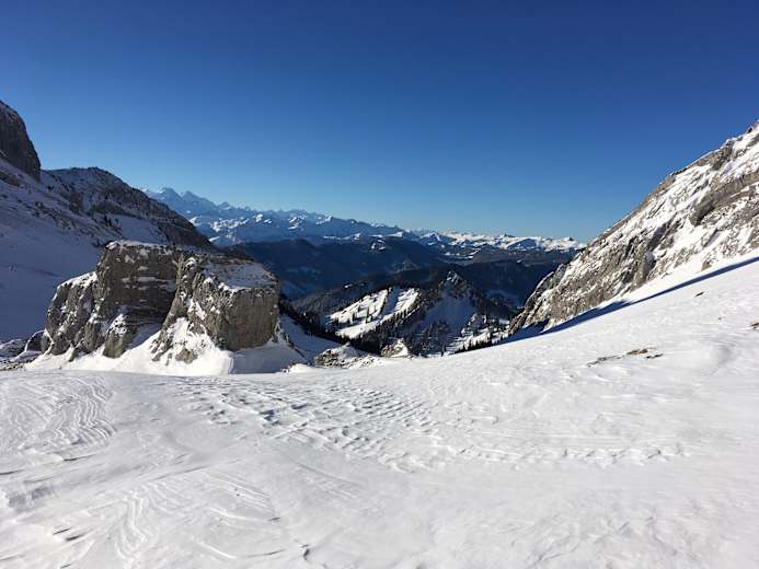 Die Gipfelterrasse linksseitig verlassen und den Hang südwärts Richtung Matthorn abfahren. Auf Höhe der Chilchsteine (1.856 m) nach rechts traversieren und nahe dem Sommerweg nach Fräkmünt (1.499 m) abfahren.