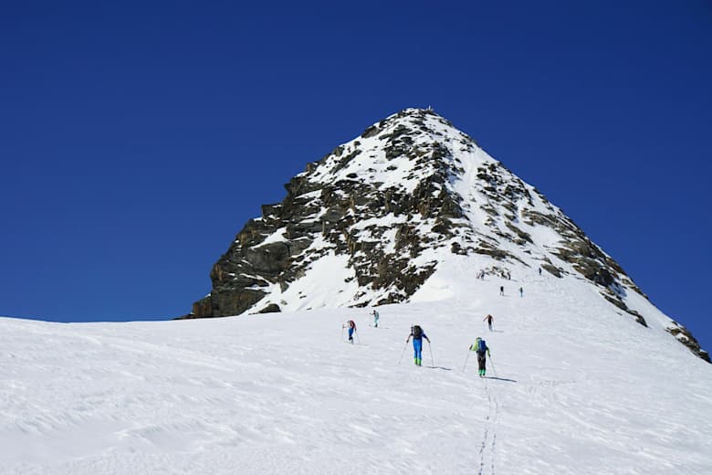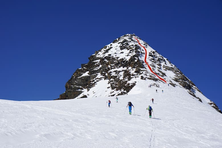 Die Skier werden nun versorgt und meistens sind für den Weiterweg Steigeisen und ein Pickel sinnvoll. Da bei viel Betrieb auch der eine oder andere Schneebrocken herunterfällt, ist auch das Tragen eines Helmes (Steinschlag- oder Skihelm) eine gute Idee. Man folgt den meist vorhandenen Trittspuren rechts (nördlich) des felsigen Grates. Zuerst flach und breiter, steilt sich das Schneefeld etwas auf und verengt sich in felsigem Gelände, bevor man das Gipfelkreuz erreicht.