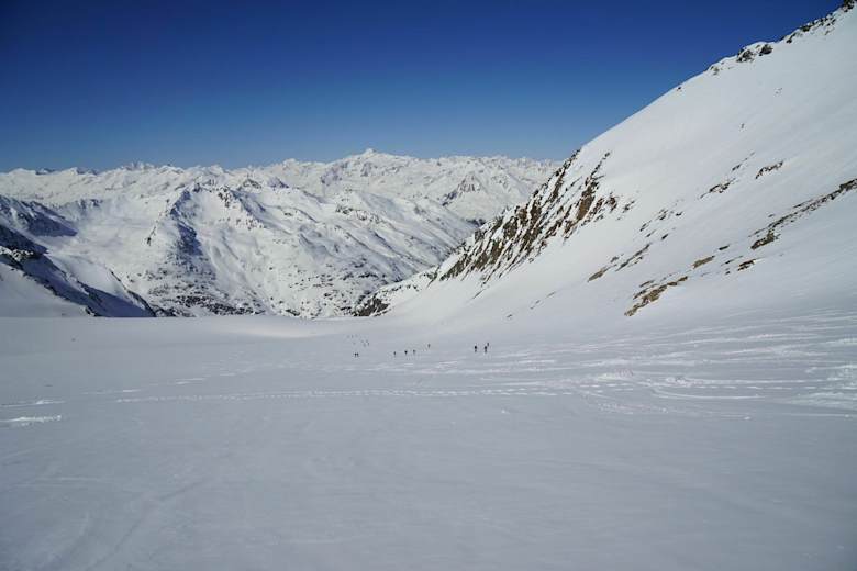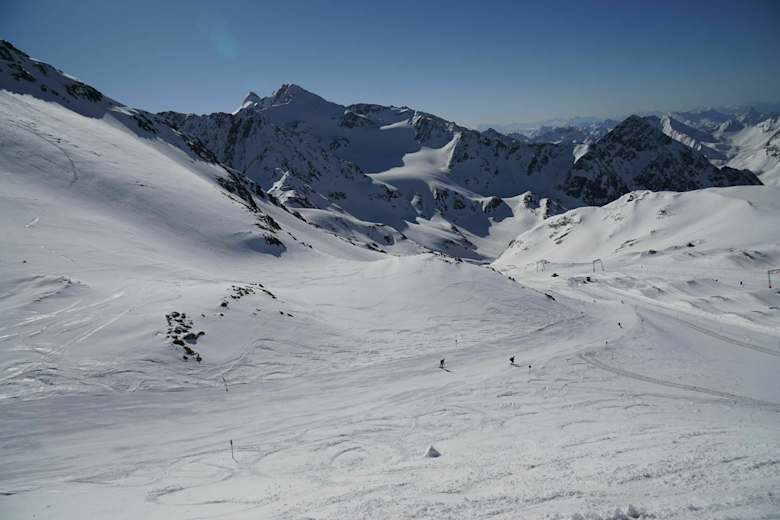 Allzuviel Zeit darf hier ohnehin nicht vertrödelt werden, denn bei der Abfahrt entlang der Aufstiegroute möchte man – zumindest im Frühjahr – den perfekten Firn nicht verpassen. Bis zum Pfaffenjoch hält sich das Vergnügen in Grenzen, dann ist das Gelände aber ideal für flotte Schwünge in zischendem Firn (oder natürlich staubendem Pulver – aber anfangs gerne auch windgepresstem Schnee…), bis man unterhalb der Mulde, die zur Talstation des Schleppliftes Gaisskarferner führt, wieder auffellt und den kurzen Gegenanstieg angeht. Mit der Lift-Tourenkarte darf man sich gemütlich hochziehen lassen, bevor man entlang der Pisten des Gletscher-Skigebietes Richtung Tal schwingt.