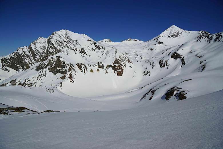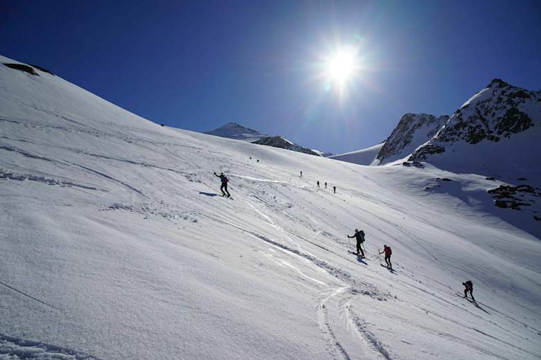 Zeit: je nach Verhältnissen und Andrang am Gipfelgrat gute 3 h zum Gipfel, Abfahrt (mit Gegenanstieg) ca. 2,5 h
