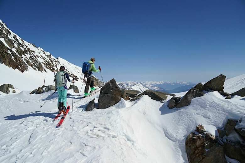 Vom Schaufeljoch geht es zuerst am Gaiskarferner auf der Piste 5 entlang dem Schlepplift zu dessen Talstation. Hier verlässt man den gesicherten Skiraum und fährt eine breite Rinne ab, die man zu Beginn des Pfaffenferners querend verlässt. Im ebenen Gelände wird aufgefellt und man bereitet sich für die Gletscherbegehung vor – auch wenn die Spaltengefahr auf den Gletschern zum Zuckerhütl gering ist, empfehlen wir ganz klar den Gurt anzuziehen und die restliche Gletscherausrüstung griffbereit zu haben.