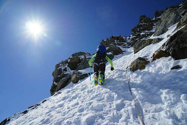 Der Aufstieg zu Gipfel ist je nach Verhältnissen oft nur mit Steigeisen und Pickel machbar. Auf dem Foto sieht man ein installiertes Fixseil.Foto: argonaut.pro