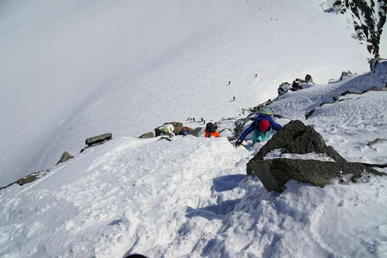 Bei viel Andrang am Gipfegrat kommt zu den technischen Schwierigkeiten (im Frühjahr nur mit Steigeisen/Pickel, WS) noch der Stress durch andere Bergsteiger hinzu, sodass sich oft chaotische und gefährliche Szenen abspielen.