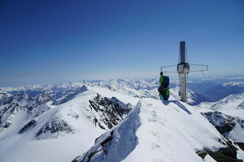 Der höchste Gipfel der Stubaier Alpen, das Zuckerhütl mit 3.507 m, ist mit Liftunterstützung bis zum Skidepot einfach, dann schwer zu erreichen. Denn der kurze aber steile Gipfelgrat darf nicht unterschätzt werden.