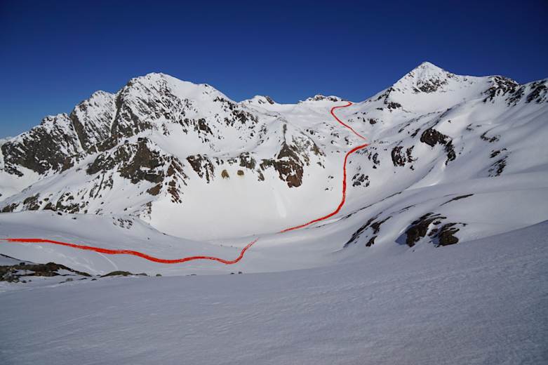…den man unterhalb der Nordflanke des Zuckerhütl leicht ansteigend quert. Nach links zweigt die Spur zum Wilden Pfaff ab.Foto: argonaut.pro