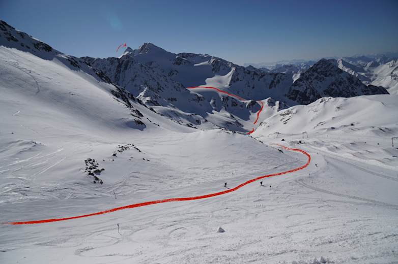 Die Abfahrt vom Schaufeljoch auf Piste 5 bis zur Talstation des Schleppliftes und weiter durch die Mulde bis zum Anfellplatz, sowie der erste Teil des Aufstieges auf dem Pfaffenferner. Nach der Abfahrt vom Zuckerhütl muss man die ca. 150 Hm bis zur Liftstation wieder aufsteigen.Foto: argonaut.pro