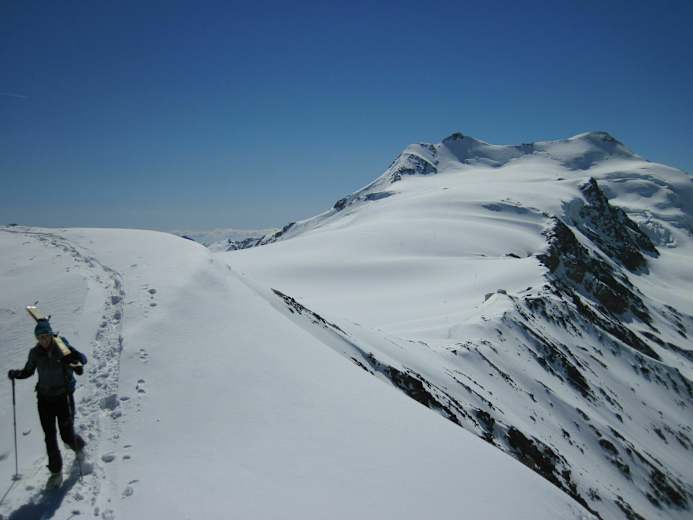 Hier entscheiden die Verhältnisse ob man über den Westgratrücken zu Fuß oder mit Skier aufsteigen kann.