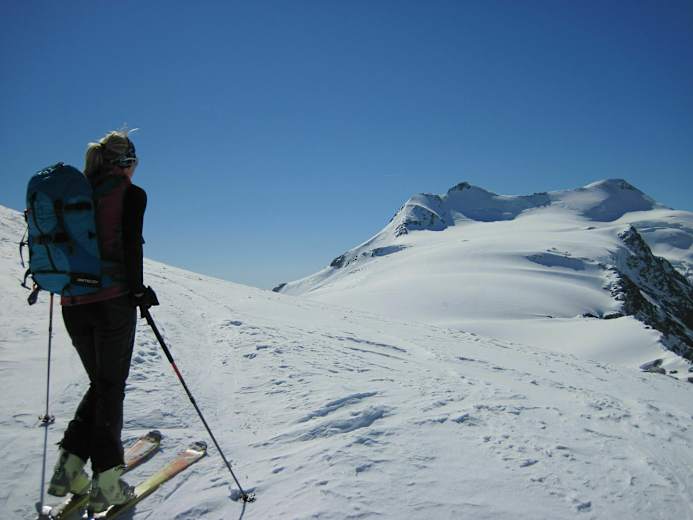 Von der Marteller Hütte führt ein langer Gletscheranstieg über den Fürkeleferner. Die Aufstiegsspur führt steil nach oben und leitet zum Schluss, die Ski am Rucksack tragend, auf eine flache Schulter auf den Ostgrat des Berges.