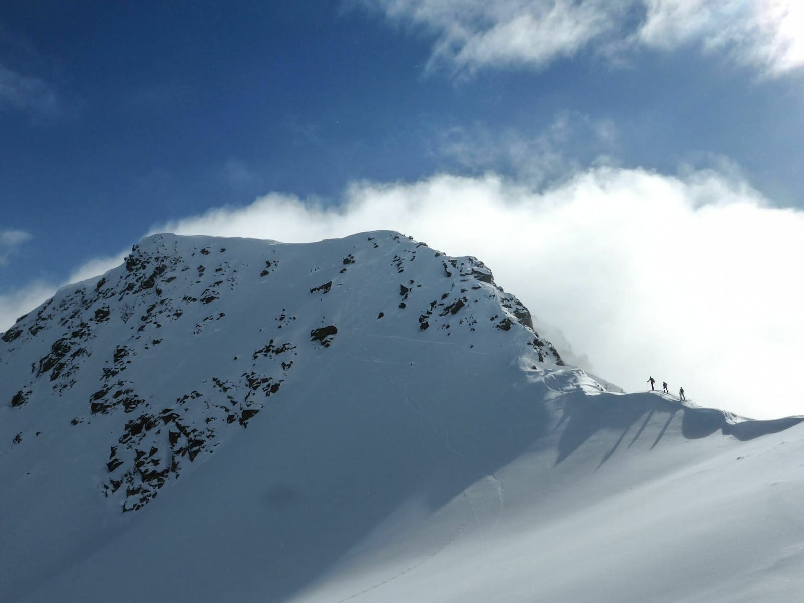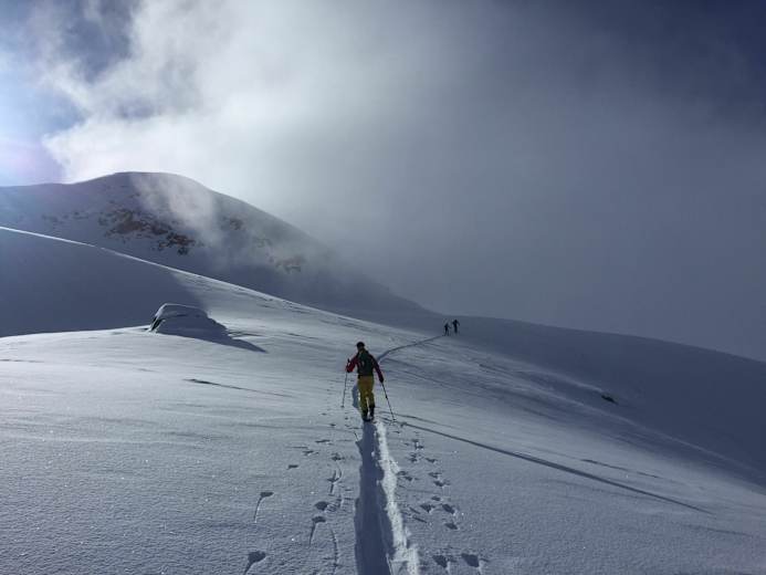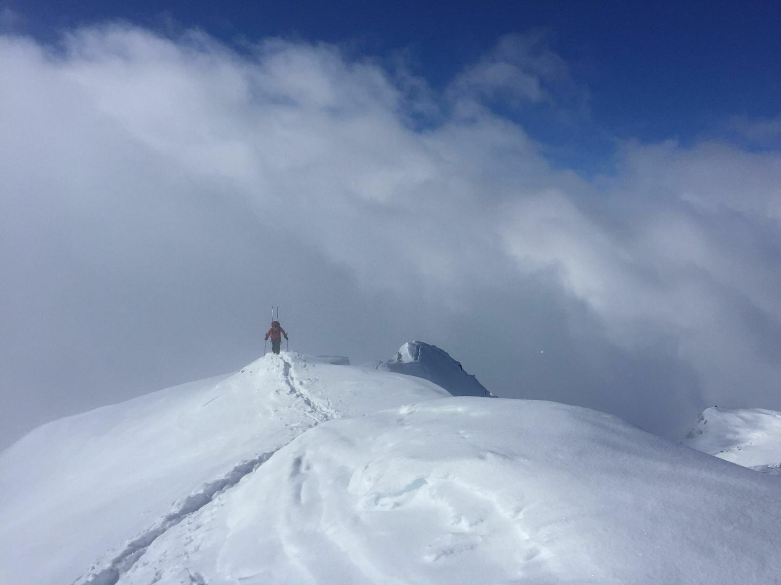 Blick auf den Gipfel mit vorgelagertem Grat Foto: Claudia Timm Am Weg zu Fuss zum Gipfel Foto: Claudia Timm Abfahrtsspass auf einer der zahlreichen Varianten Foto: Claudia Timm Bildergalerie (5)