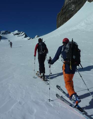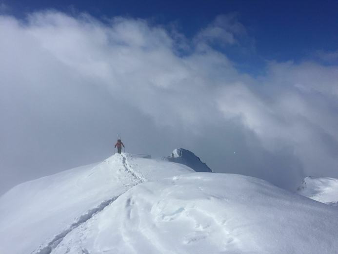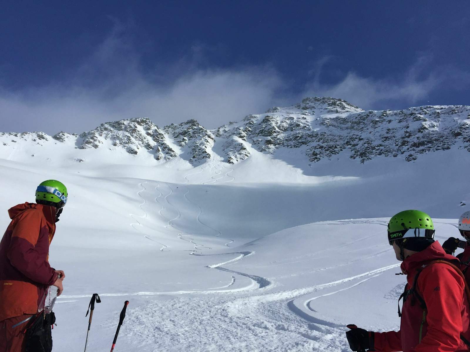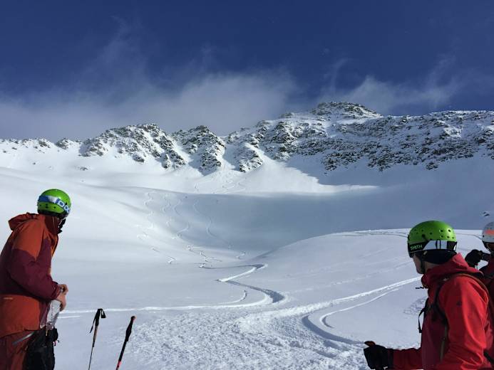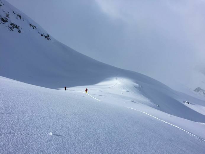Bei sicheren Verhältnissen lohnt es sich die Ski mit auf den Gipfel zu nehmen und in die steile Westflanke des Vorgipfels einzufahren. Den kleinen Gegenanstieg zurück zur Aufstiegsspur nimmt man für dieses Erlebnis gern in Kauf.