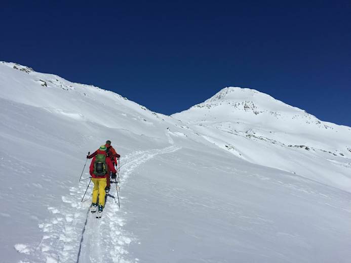 Mit möglichst wenig Höhenverlust in die nächste Geländemulde, dann wieder steiler hinauf zum Lai Verd (2.702 m). Nun nordwärts in Richtung Fuorcla Gannaretsch. Man steigt die steile SW-Gipfelflanke so weit als möglich hoch und richtet auf dem W-Grat ein Skidepot ein. Über einen leichten Blockgrat unschwierig zu Fuss auf den Gipfel (3.040 m). Bei schlechten Verhältnissen können Pickel und Steigeisen hier eventuell nützlich sein.