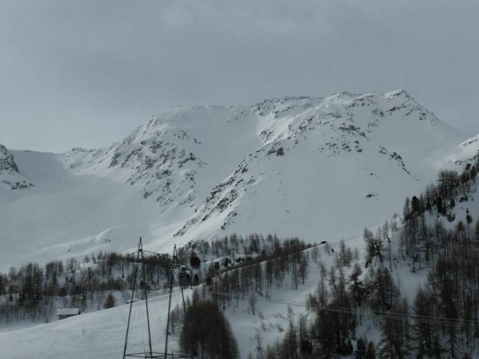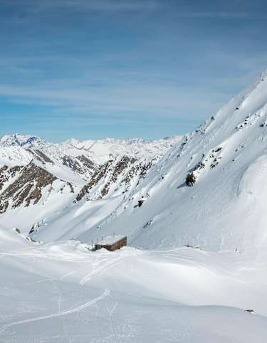 Vom Gipfel noch ein kleines Stück am Grat entlang Richtung Osten, dann scharf nordwärts in den schönen, breiten Gipfelhang einfahren. Am Ausgang des breiten Kars über eine Steilstufe weiter Richtung Nordost abfahren.
