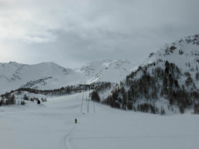 Am tiefsten Punkt auf etwa 1.740 m angekommen, heisst es anfellen und den kleinen Gegenanstieg von etwa 120 hm über den Sommerweg in Richtung Westen bewältigen. Bei Lareccia kommt man wieder in Sichtweite der Aufstiegsspur, hält sich jedoch weiter rechts und versucht ohne großen Höhenverlust mit etwas Anschieben zurück zum Bach zu gelangen.