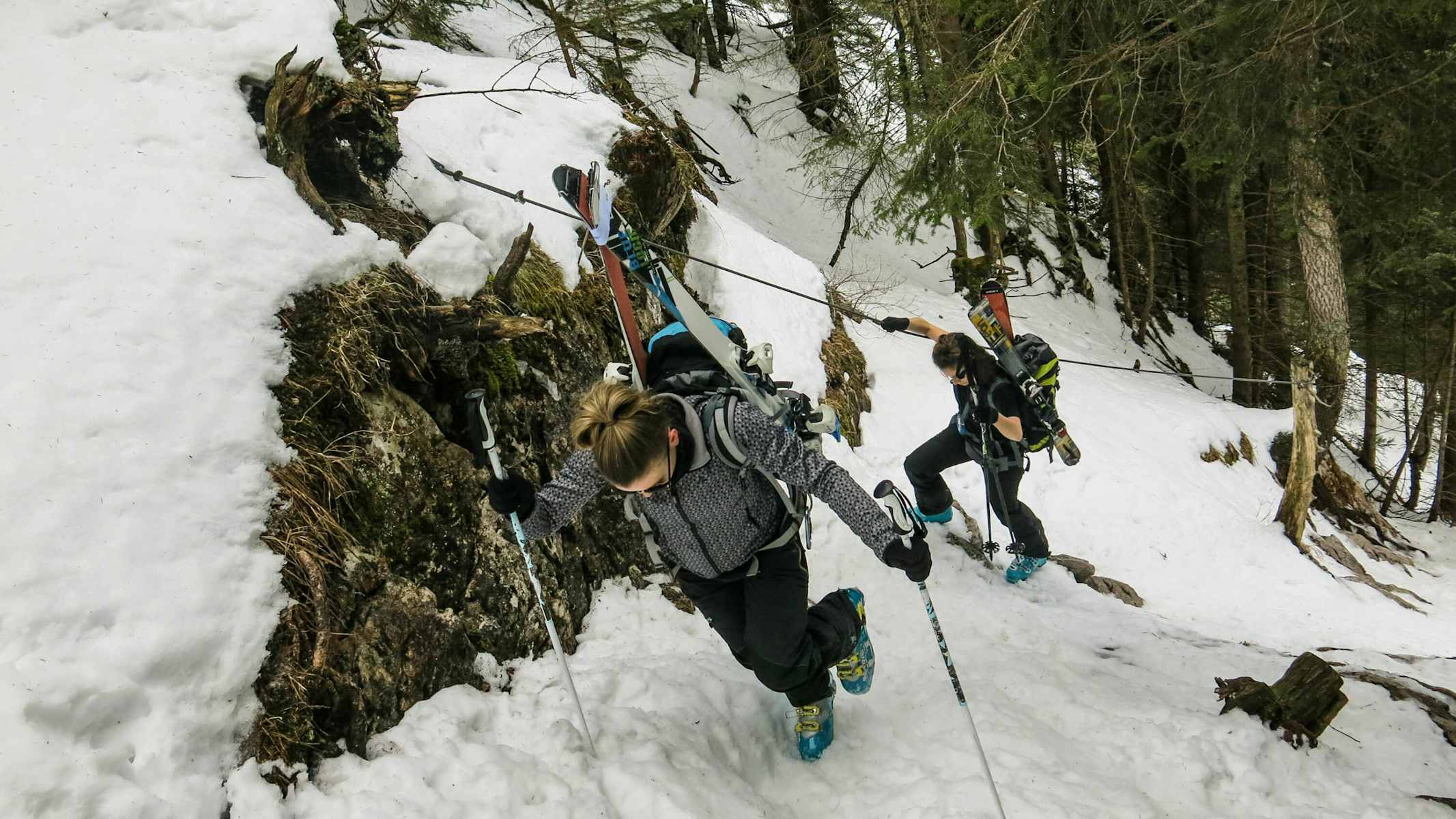 Ausgangspunkt der Tour ist am gebührenpflichtigen Parkplatz in Hinterbrand – hoch über Berchtesgaden. Der Anstieg folgt zunächst der Strecke auf den Hohen Göll. Hierfür geht es hinein ins Alpeltal, wo gleich zu Beginn die Schlüsselstelle wartet. Eine Tragepassage führt steil an einem drahtseilgesicherten Abschnitt („Drahtseilwandl“) über die erste Felsstufe bergan. Nach einem Waldstück geht es durchs freie Gelände und über eine zweite Steilstufe weiter hinauf.