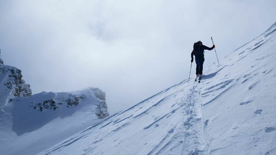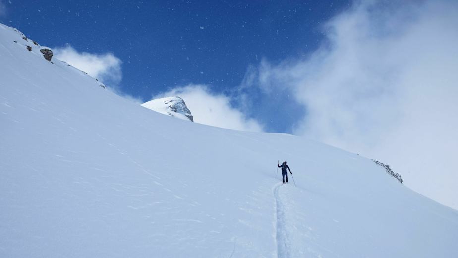 Der Aufstieg führt dann in Richtung Nordwesten hinauf aufs Simelihorn. Zunächst verläuft die Tour recht einfach und in sanfter Steigung, dann bekommt sie bald alpinen Charakter. Im Gipfelbereich steilt das Gelände auf und macht Spitzkehrentechnik erforderlich. Hat man den Sattel erreicht, werden die Ski abgeschnallt und die letzten Höhenmeter hinauf zum Gipfel zu Fuß genommen.