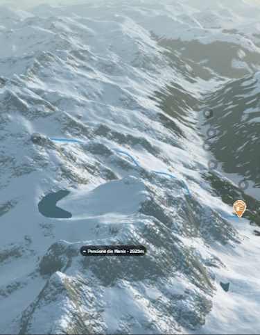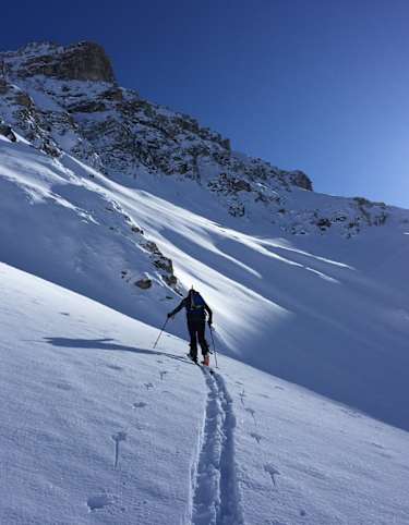 Von der Albert-Heim Hütte (2.542 m) in einem großen Bogen zum Fusse des Sunnig Bergs auf 2.381 m abfahren. Hier anfellen und durch das breite Kar über zwei Steilstufen in nordwestlicher Richtung zur Winterlücke (2.852 m) aufsteigen.