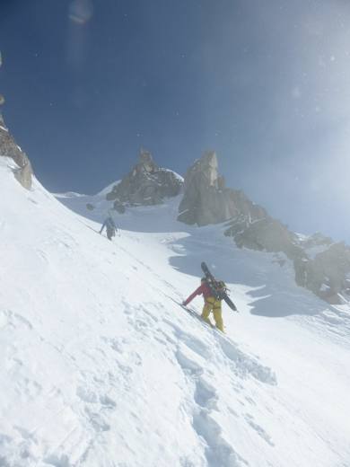 Der Ausstieg aus dem Couloir befindet sich direkt beim P. 3073 (Nordwestgipfel), welcher einfach zu erklettern ist. Nur wenig später erreicht man den Hauptgipfel, (3.039 m), der mit einer spitzen Felsnadel über dem Firn thront.