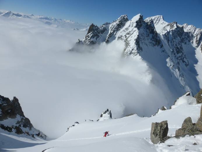 Von der Lücke traversiert man noch ein kleines Stück auf Skiern entlang des Rückens Richtung Lochberg und bewältigt dann je nach Verhältnissen circa die letzten 100 Hm das zum Teil steilen Gipfelcouloirs zu Fuss. Je nach Schneesituation können hier Steigeisen und Pickel hilfreich sein.