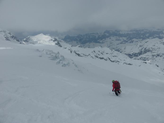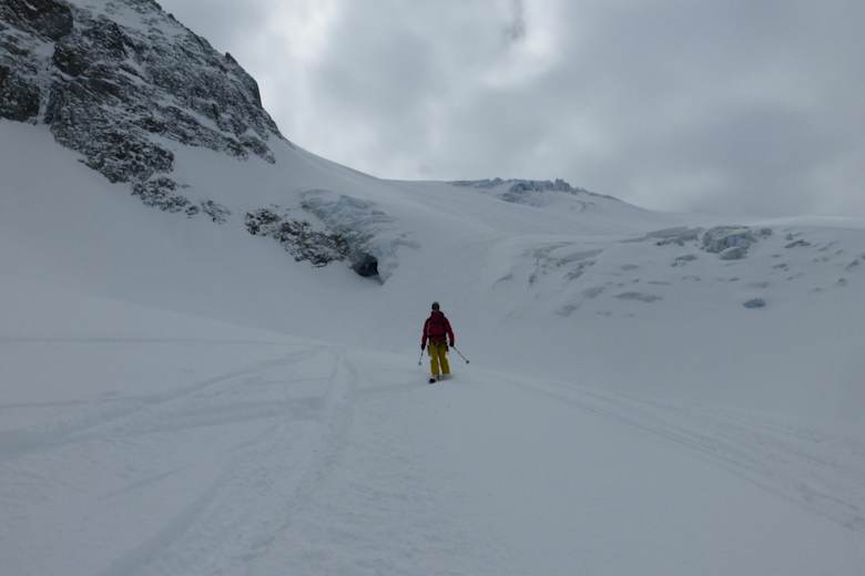 Je nach Schnee- und Spaltensituation ist vom Gipfel nach Passieren des Felsbandes auch eine direktere, steilere Abfahrt möglich.