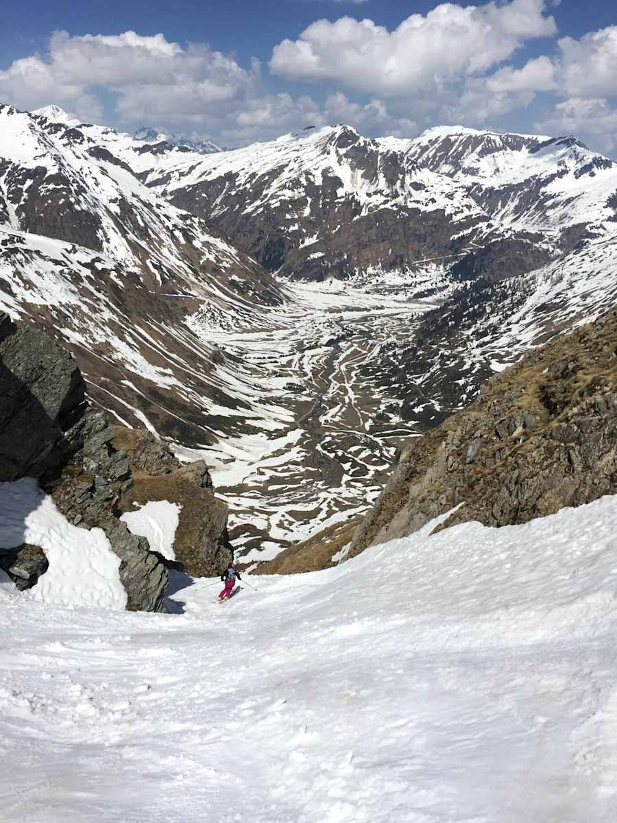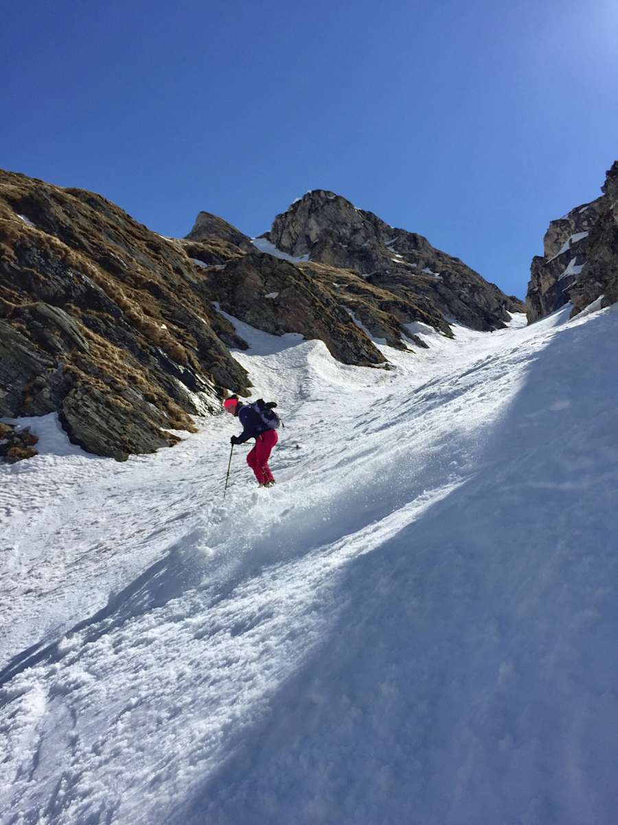Die Abfahrt bietet anfangs noch schöne breite Hänge und verengt sich dann an einem Felsdurchlass zu einer Rinne. Vorsichtig in die Engstelle einfahren, hier beträgt die maximale Hangneigung kurz 45 °.