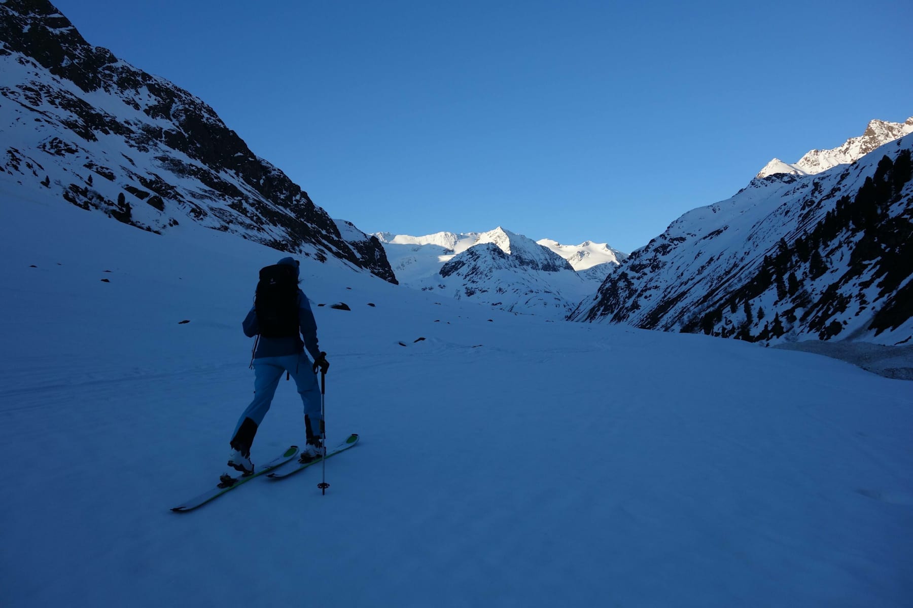 Von der Taschachalm geht es ein kurzes Stück hinunter zur Wasserfassung der Tiroler Wasserkraft. Ein kurzes Stück nach dieser überwindet man zwei Kehren, bis es wieder flacher vorbei am „Birkenwaldl“ geht. Über den „Schwarzen Bach“ ist im Frühling meist schon der Steg ausgeapert. In diesen Bereichen müssen oftmals große Lawinenkegel überwunden werden.