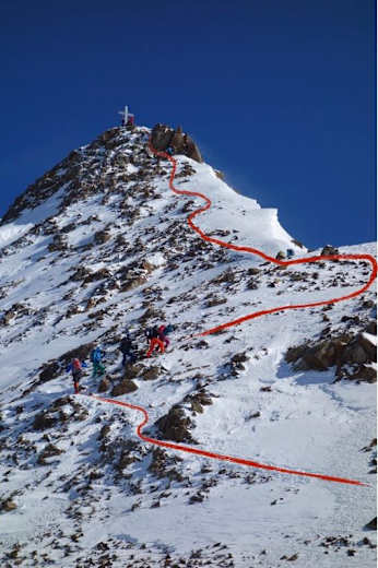 An schönen Frühlingstagen und bei Betrieb der Gletscherbahn kann es zwischen dem Skidepot und dem Gipfel durchaus zu Stausituationen kommen.