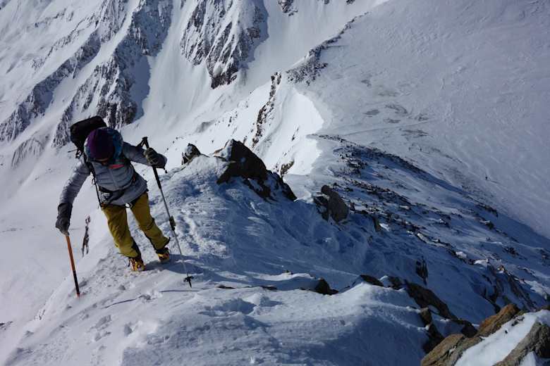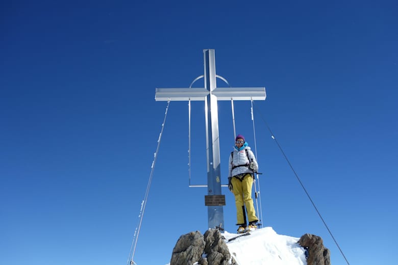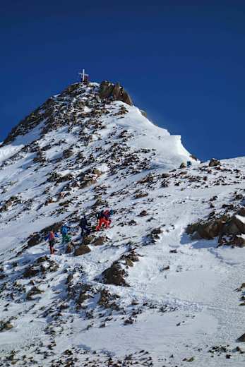 Hier werden üblicherweise die Ski gegen Steigeisen und Pickel getauscht; bei günstigen (eisfreien) Bedingungen ist der Anstieg über den Südgrat (eine Stelle II+) für sichere, erfahrene Skitourengeher gut bewältigbar. Für unerfahrene Bergsteiger empfiehlt sich für diesen etwas ausgesetzten Grat mit der II+ Stelle, die eventuell mit einer Seilsicherung zu sichern ist, unbedingt, sich einem Bergführer anzuvertrauen.