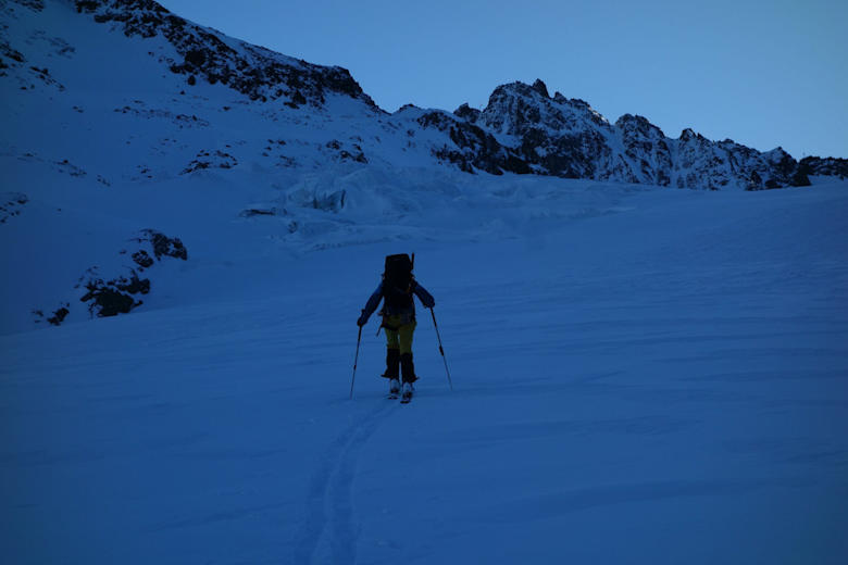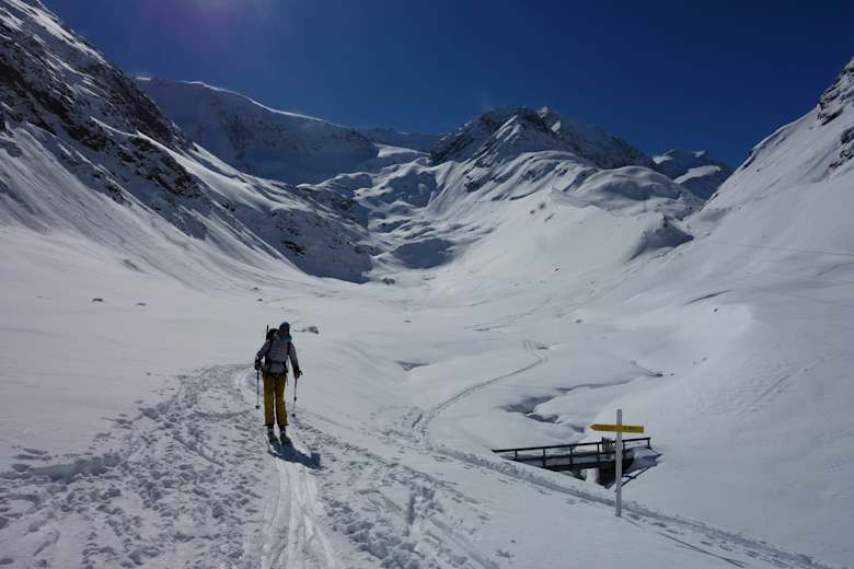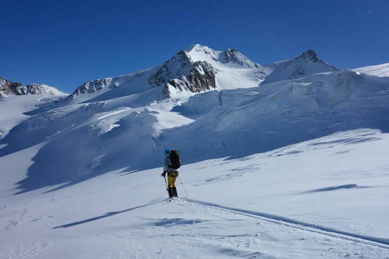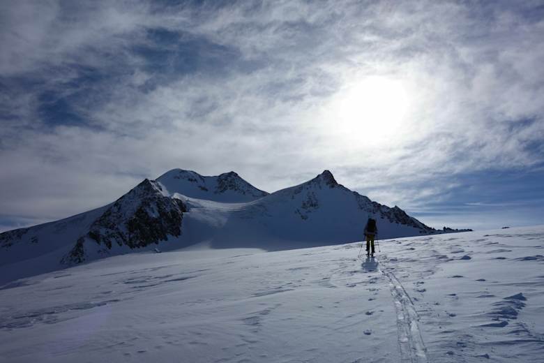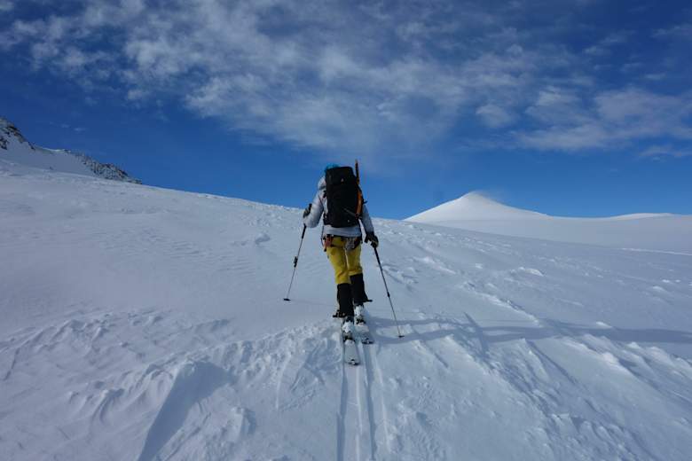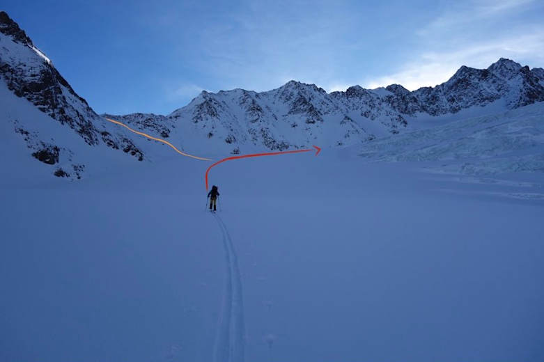 Nach einer Nacht im Winterhaus des Taschachhauses fährt man am nächsten frühen Morgen mit den Skiern bis zum Moränengelände wieder ab. Dort fellt man auf und steigt entlang des Moränengeländes in südlicher/südöstlicher Richtung die steilen Flanken des Urkundkopfes entlang bis zum Taschachferner.