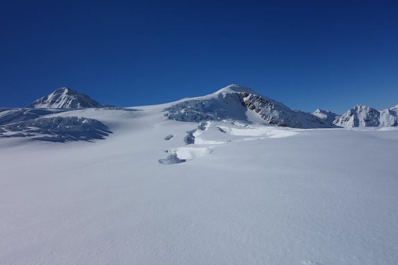 Diesem Gletscher folgt man nunmehr ziemlich mittig: zwischen 2.600 m und 2.800 m ist beidseitig auf Gletscherspalten zu achten.